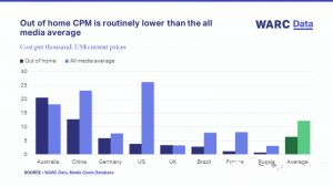 來(lái)自WARC媒體成本數(shù)據(jù)庫(kù)的數(shù)據(jù)顯示,除了澳洲和英國(guó),戶外在全球主要市場(chǎng)的千人成本一般比所有媒體的平均千人成本都要低。